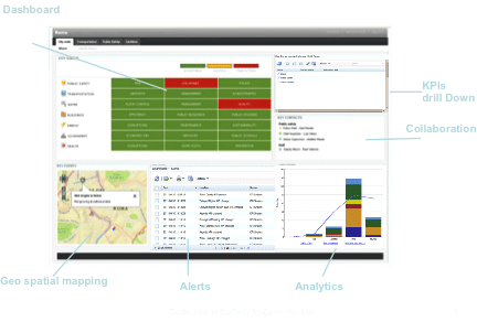 Portal : This component would aggregate the different pieces of analytics, geospatial, advanced visualisation, collaboration, SOPs, alerts (generated out of the correlation and rules engine) in a one single view, with a role-based access. Each solution component would correspond to a portlet (you can think of this is as a mini window) in the portal.