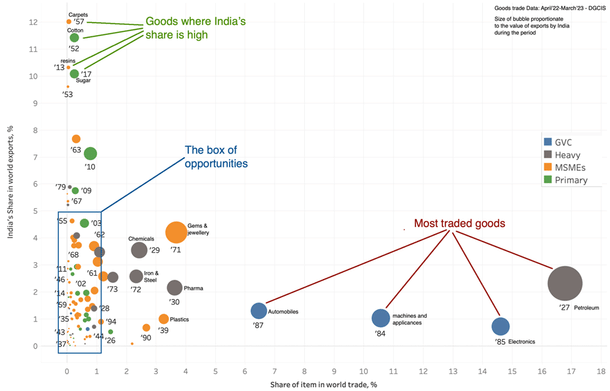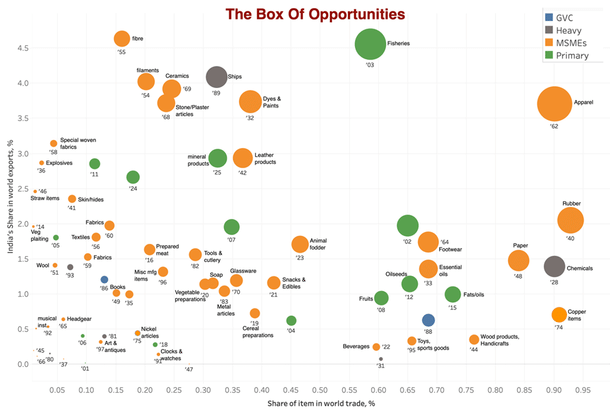 This zoomed-in view focuses on the 'box of opportunities' where sectors inherently suitable for MSMEs are represented. These sectors, with a share in the global market below 1 per cent, and India's share in global trade of these items under 5 per cent, represent areas of untapped potential.