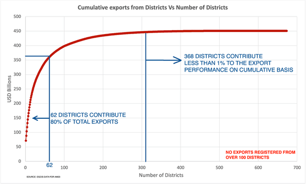 According to the data for FY April 2022-March 2023, 10 per cent of our districts account for over 80 per cent of our exports. There are around 100 districts that do not export. Even among those that do, there are over 350 districts that together make up less than 1 per cent of total exports.