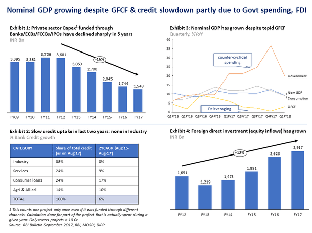 The Finance Ministry deserves credit for its brave decision to not pass the benefit of lower oil price to consumers and use it for counter-cyclical capex and other spending despite serious opposition. Secondly, prudent macro-management by a stable and reform-minded government has led to a significant boost in foreign direct investment (exhibit 4), which has also counter-balanced the capex and credit slowdown.