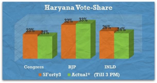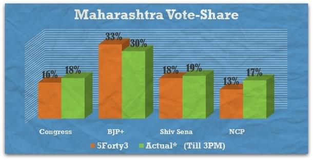 Here we must stress our own Pre-poll projections which had almost 97% accuracy rates in terms of vote-share projections. The only jarring note being the under-estimation of NCP, which is a classic case of a small regional party being under-represented in sample surveys. For any pollster, getting a clear picture of differential votes in a massively divided 4 to 5 cornered contest is almost a nightmarish scenario. Yet we almost accurately projected the possible vote-share of different parties within the internationally accepted error margins. Of course, as we had been stressing again and again, converting votes to seats is a dark art in the Indian electoral scene as it simply has no mathematical or statistical foundation to rely upon. Having said that, our seat-share projections were spot-on for Haryana, but we did falter in about 20-30 odd seats in Maharashtra.