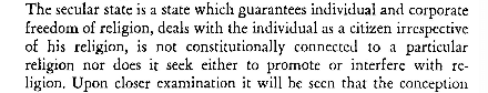 As we can see, there are three distinct entities involved here: the state, religion and the individual. To define and discuss the Secular State as being constituted merely by a seperation of church and state without due concern to other relationships namely the relationship between the State and the individual or between the religion and individual is, according to Smith, not wise.