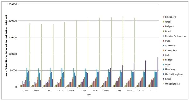 There are some interesting trends to note here, even though the data goes only up to 2011 (World Bank 2014) for most countries of interest: China’s growth rate appears to have been exponential over the past decade, despite producing barely half of the output that the United States does. European countries such as France, Germany, and Italy appear unable to keep pace with Chinese scientists, while Japan’s output has been consistently in the top five in the past two decades.