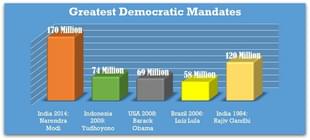 Truth at times must be stripped of its cloak of commentary and be told in bare essentials, for plain truth at times is greater than the narrative surrounding it. Truth be told, Narendra Modi has got the greatest democratic mandate in the history of mankind, for no other leader or political party has got a bigger endorsement from voters in terms of raw numbers. A mindboggling 17 crore or 170 million people voted for Modi’s BJP in the summer of 2014, an unprecedented event in human civilization for its sheer magnitude. To put these numbers in perspective, let us consider this – Barack Obama won the 2012 presidential election by securing 6.5 crore or 65 million votes, while the Modi mandate of 2014 is close to triple that number!