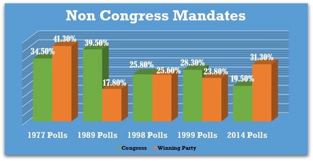 At the data labs of 5Forty3, we back-tested, analysed and correlated the mandate of 2014 over the last few months in order to understand the historic context. The results told us a story that was unique in every aspect from all the elections that India has undergone in the last 65+ years. From such broader themes of this being the first time a non-Congress party getting a majority on its own (even the JP experiment of 1977 was a coalition for all practical purposes) to deeper details of stitching together an unprecedented almost Hindu-only social coalition, 2014 has not only been a history-defying election – whence a non-Congress winner has a comfortable double digit percentage margin over Congress – but also may alter the course of history.