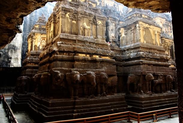 Kailasha temple also has beautiful narratives from the Ramayana and Mahabharata on either side of the mandapa. The national epics of India shown on either side also indicate the oneness of the nation.