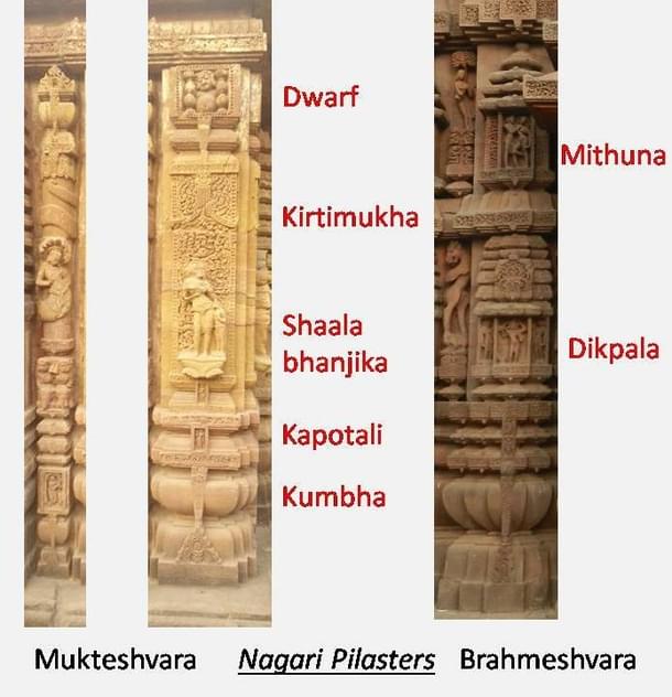 The walls of early Nagari temples are plain, but later temples use pilasters of different styles adjacent to each other. The Mukteshvara temple features a cylindrical pilaster with a naga winding around, and a shadvarga flat pilaster with a dwarf, a shaalabhanjika etc. In contrast, Brahmeshvara temple features a two part pilaster with a mithuna couple, a dikpala et cetera.