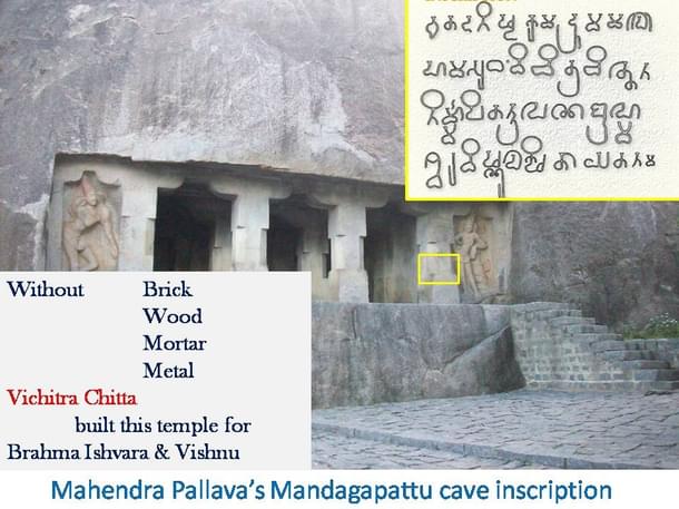 An ancestor of Narasimha, Mahendra Pallava, left us a fascinating inscription in a granite cave temple excavated into a rocky hill, in Mandagapattu, in Viluppuram district of Tamil Nadu.