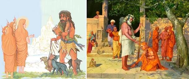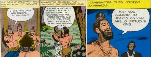 Interestingly, an inverse of Viswamitra episode is also given in Mahabharata. Uttanka a Brahmin sage obtains a boon from Krishna that he should get water whenever he became thirsty. Once in a deserted, feeling thirsty, he wanted water and there appeared at once a Chandala with his dogs and offered the water he carried. The Brahmin seer of course rejected the water with contempt. Then the Chandala disappeared. Krishna explained that Indra was ready to give Uttanka the nectar of immortality provided the seer could rise above the social discrimination and see the universal oneness.