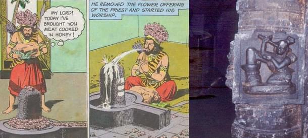Important in this context is the very popular account of Kannapa - the tribal devotee. The tribal placing his foot on the Sivalinga offering his own eyes is depicted in all Siva temples emphasising that true spirituality transcends ritual purism. Such depictions of tribal communities account for the relative high degree of freedom and autonomy these communities enjoyed before colonialism alienated, impoverished and criminalised these communities.