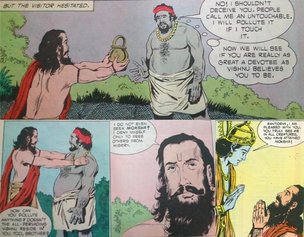The story of Rantideva is told in Bhagavatam and is very famous throughout India. The king Rantideva having sacrificed everything when about to eat his meal was interrupted by a steady stream of people seeking alms. It started with a Brahmin and ended with a Chandala who asked for even the leftovers. The erstwhile king happily gave away what was left to the Chandala, he himself going hungry. Even as he tried to quench his thirst, the Chandala again asked for that water too. And the king happily offered that water to the Chandala. And this won him the ultimate liberation.
