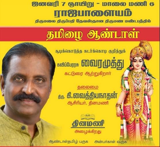 These attempts, almost akin to Gaznavi - Malik Kafur raids on our cultural and literary monuments, should be protected by us with vigilance and intelligence. But tell me, why call a known Hindu baiting lyricist for a function on Aandal? That is the original sin,” he says.