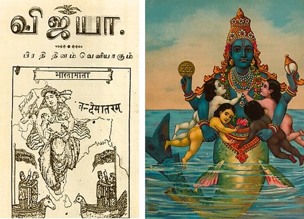 The form of Bharat Mata that Bharathi used in his magazine derives heavily from a famous calendar art lithograph of that time - Maha Vishnu taking the fish-avatar and rescuing the four Vedas stolen by one Hayagriva. The four Vedas in the form of children cling to Vishnu who holds them like a mother.