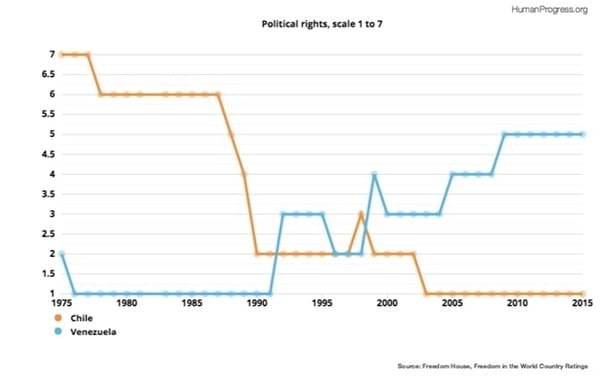 Here’s a chart showing the remarkable progress in Chile..as well as the deterioration of rights in Venezuela (please note that “1” means strong political rights and “7” means low or nonexistent political rights).
