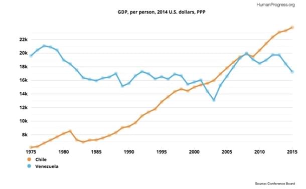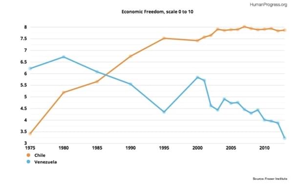 Chile’s success starts in the mid-1970s, when Chile’s military government abandoned socialism and started to implement economic reforms. In 2013, Chile was the world’s 10th freest economy. Venezuela, in the meantime, declined from being the world’s 10th freest economy in 1975 to being the world’s least free economy in 2013.