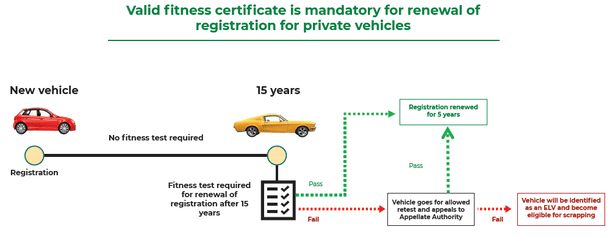 Private (non-transport) vehicles are to be declared as ELVs if found unfit in fitness test, re-test and re-inspection, if ordered by an appellate authority at the time of renewal of registration.