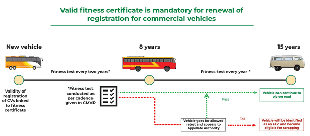 In the case of commercial vehicles the fitness certificates are issued for new vehicles for two years and subsequently renewed for one year. The ministry amended rule 62 of the Central Motor Vehicles Rules, 1989 in 2018 vide which renewal of certificate of fitness in respect of commercial vehicles is two years for vehicles up to eight years old and one year for vehicles older than eight years.