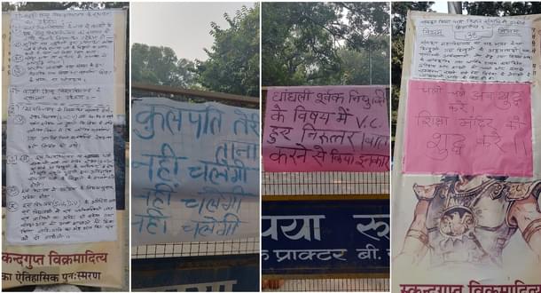 Over a hundred students then sat on dharna outside the building that houses the office of the Vice-Chancellor Rakesh Bhatnagar, with posters saying ‘V-C murdabad’ and ‘Kulpati teri taanashahi nahi chalegi’ (Vice-Chancellor, your dictatorship won’t work). The building gates were closed, with several security guards nearby.