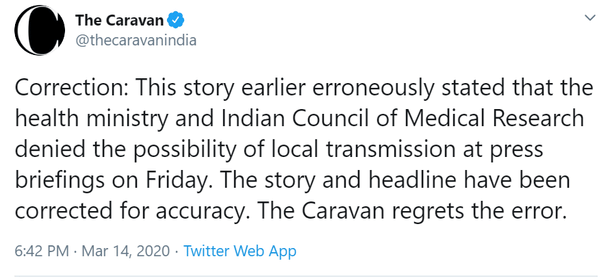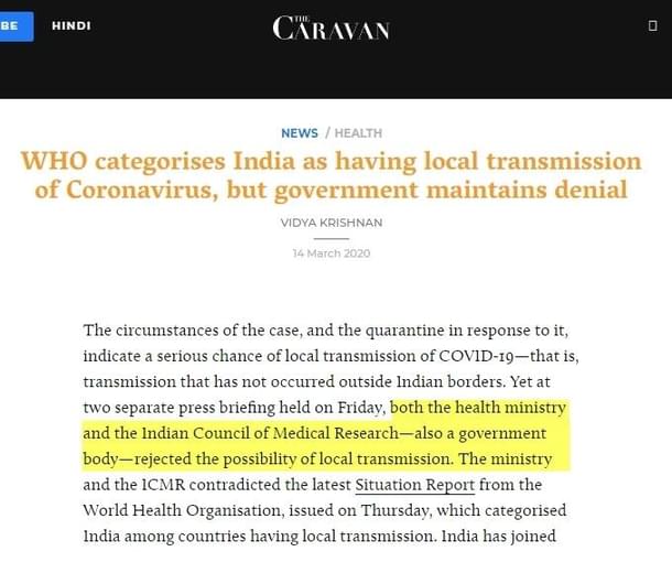 Vidya Krishnan’s story for The Caravan Magazine on 14 March 2020 had claimed that while the World Health Organization (WHO) categorised India as having local transmission, both the Indian Council of Medical Research (ICMR) and the Indian government were denying it.