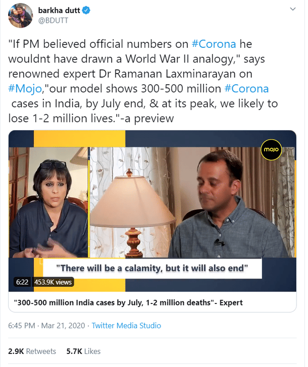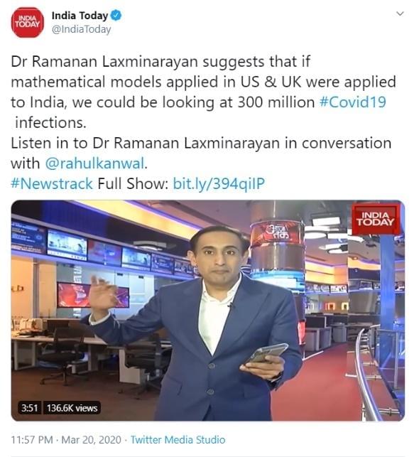 Interviews and discussions with one Ramanan Laxminarayan by journalists Rahul Kanwal and Barkha Dutt where Laxminarayan implied that his model predicts over 30-40 crore Indians contracting Covid-19 ended up as faux pas moments for them.