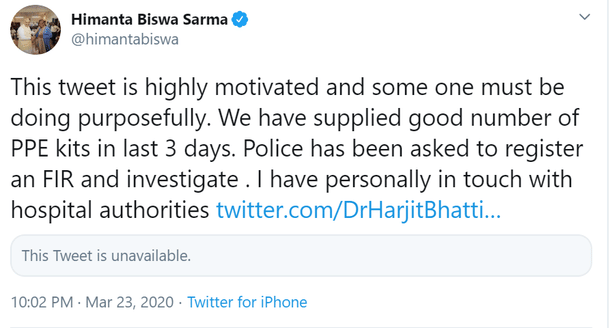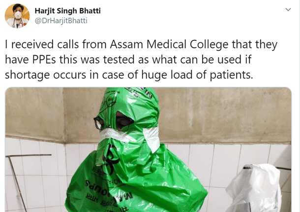 Funnily enough, Dr Bhatti retweeted the image later, claiming that he got calls from Assam Medical College, and that while they have PPEs, the plastic suit was ‘tested’ for use should a shortage occur.