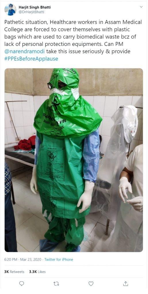 Dr Harjit Bhatti, the National Convenor of the Youth Congress’ All India Medical Cell took to Twitter to claim that Assam Medical College’s health workers were forced to cover themselves in plastic bags used to carry biomedical waste.