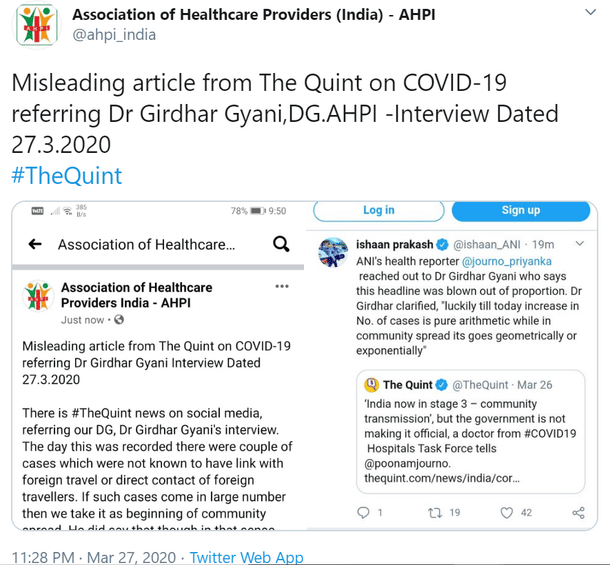 Further, the Association of Healthcare Providers India (AHPI) of which he is the director general, dismissed the story, calling it misleading.