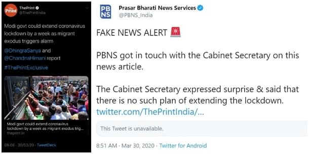 It was a timely action on the part of the Prasar Bharati News Services (PBNS) that punctured this rumour-mongering. PBNS got in touch with the Cabinet Secretary, who stated clearly that there is no such plan of extending the lockdown.