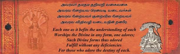 The general understanding of this verse, which has become part and parcel of the Hindu pluralist culture, particularly in Tamil Nadu (and through Sri Ramanuja, throughout India), is that one should worship the Divine in any form but condemn none’s deity as inferior; for, to all sincere devotees of all deities, it is Vishnu who provides grace through those forms.