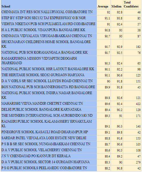 This is based on data available for some prominent schools affiliated to the Council for the Indian School Certificate Examinations. The metric used is the percentage marks in English plus the best three subjects. Scores in subjects like physical education and painting have been ignored wherever students have opted for them as an additional subject (sixth subject).