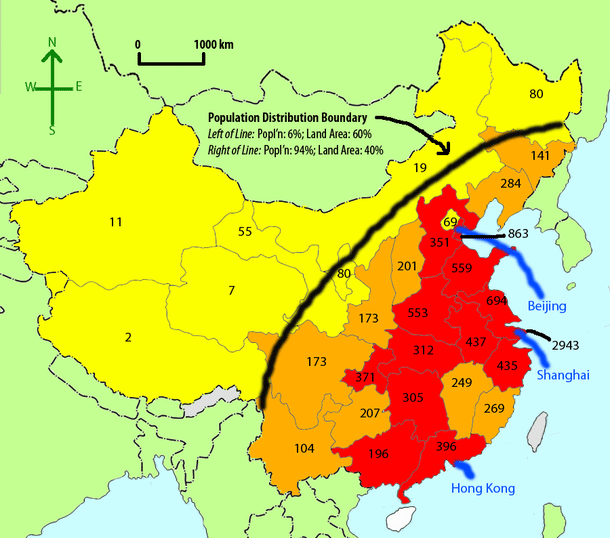 To understand this better, let us have a look at India's population density (credit for map here) and then compare that with China below. More than half of India's population (by the 2011 census) lives in the following dozen states: Uttar Pradesh, Bihar, Madhya Pradesh, Rajasthan, Jharkhand, Assam, Punjab, Chhattisgarh, Haryana, Jammu and Kashmir, Uttaranchal, and Himachal. None of these big states have direct sea access – indeed other north-eastern states and Telangana also do not have sea access, but I am not even counting them.
