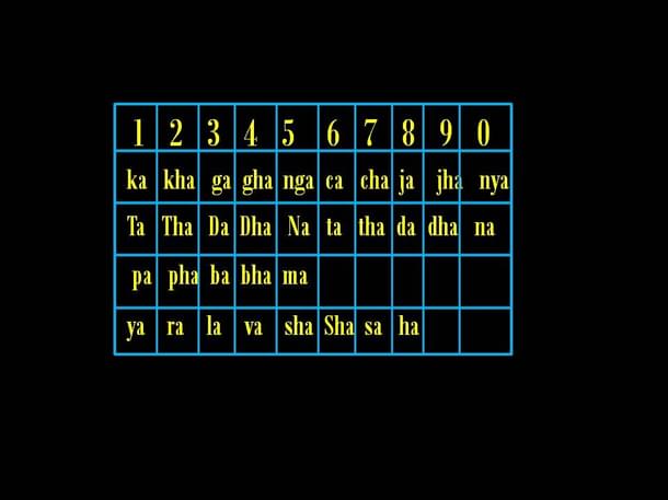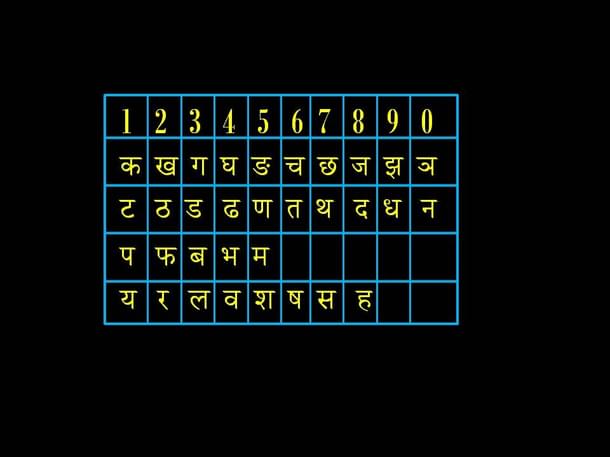 The other system to represent numbers was using letters instead of words. The consonants (vyanjanaa) of the Sanskrit alphabet were arranged in the order of the table below.