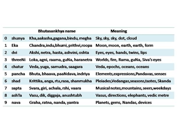 Bhuta means body. Sankhya means number. In the BhutaSankhya system, instead of the familiar number names, the names of objects representing their values are used. The table below features, Numbers 0 through 9, their familiar number-names, the BhutaSankhya synonyms and the meanings of those words in English.