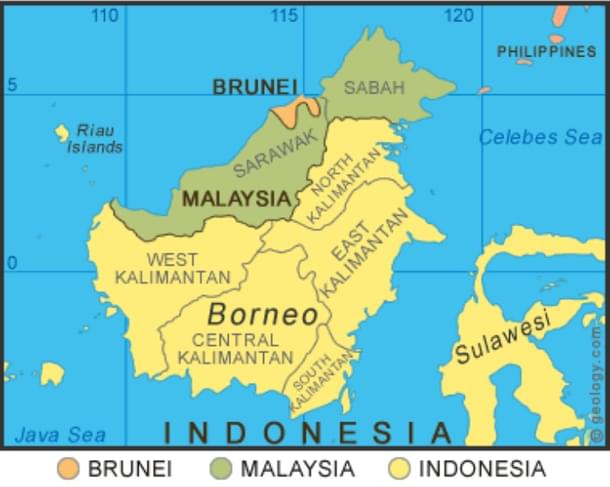 Borneo is divided between Indonesia, Brunei, and Malaysia. It is the largest island of Asia.