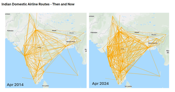 Meanwhile, since its launch in 2017, the Regional Connectivity Scheme (UDAN) has been progressively increasing accessibility to air travel and connecting smaller cities. The number of routes served in domestic market has increased from 215 in April 2014 to 540 in April 2024.