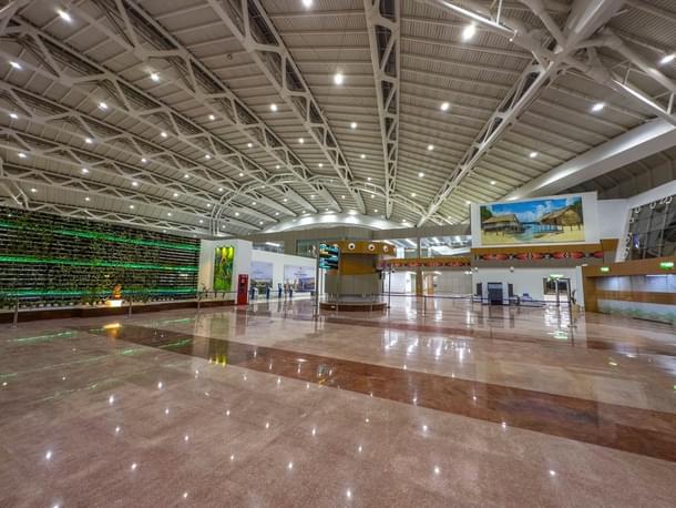 The terminal building is equipped with 28 check-in counters to facilitate smooth passenger flow, three passenger boarding bridges for convenient boarding and disembarking, and four conveyor belts for efficient baggage handling.