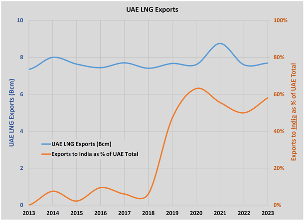 The quiet winner has, however, been the UAE. While its overall LNG sales have stayed stuck at around 8 bcm per annum, the volumes it sold to India started rising quite steeply from 2018; and today, 60 per cent of Emirati LNG goes to India.