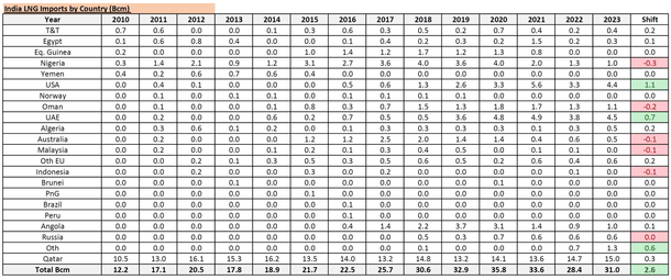 This article focuses on gas imports, and a table of country-wise sourcing of volumes since 2010 is given below. Units are in billion cubic metres (bcm).