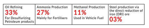 Hydrogen has been used as a raw material and utility over a long period in the fertilizer, chemical and petroleum refining industries. The current applications mainly include industrial processes, semiconductor industry, rocket fuel, and spacecrafts. The top four single uses of Hydrogen today (in both pure and mixed forms) are shown in the image.
