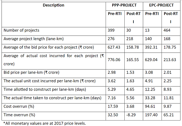 Lets’ discuss some important results. Firstly, there was no significant difference in average project length before and after implementation of RTI. However, the average project bid price has reduced by 75 per cent for PPP projects and 54 per cent for EPC projects.