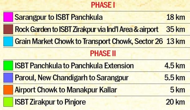 The second phase — which will be developed after 2037 — will cover four routes: Panchkula ISBT to Panchkula Extension; Paraul, New Chandigarh to Sarangpur; Airport Chowk to Manakpur Kallar; and Zirakpur ISBT to Pinjore ISBT.