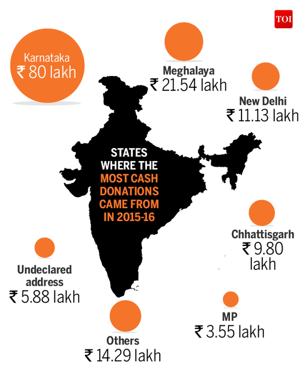 Congress-led Karnataka topped the list of states from where the most cash donation came. Another Congress-ruled state, Meghalaya, come in at close second, followed by AAP-led Delhi.
