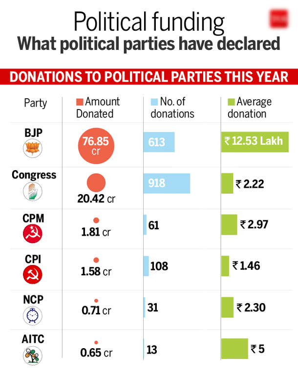 Seven national political parties have declared the donation received by them in amounts larger than Rs 20,000. According to data accessed by Time of India, presented in the chart below, donations saw a sharp decrease of 84 per cent as compared to last year.