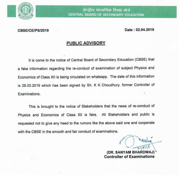 "It is come to the notice of Central Board of Secondary Education (CBSE) that a fake information regarding the re-conduct of examination of subject Physics and Economics of Class XII is being circulated on whatsapp. The date of this information is 28 March 2019 which has been signed by K K Choudhury, former Controller of Examinations. This is brought to the notice of Stakeholders that the news of re-conduct of Physics and Economics of Class XII is fake," the Board said.