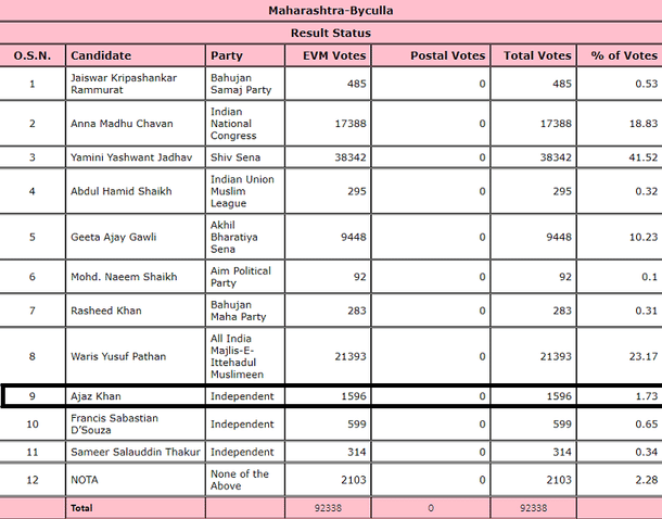 Controversial actor Ajaz Khan who had decided to contest the Maharashtra Assembly polls from Mumbai’s Byculla is currently languishing in the sixth position. He is trailing the current leader who is Shiv Sena’s Yamini Yashwant Jadhav by over 36,000 votes.