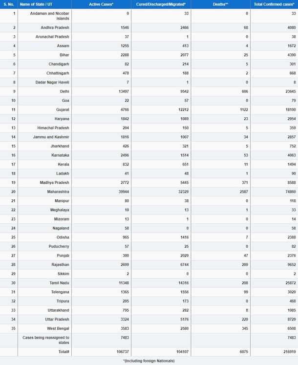 Among other states/UTs where corona cases have surged past 2,000-mark are West Bengal (6,508), Bihar (4,390), Andhra Pradesh (4,080), Karnataka (4,063), Telangana (3,020), Haryana (2,954), Jammu and Kashmir (2,857), Punjab (2,376) and Odisha (2,388).