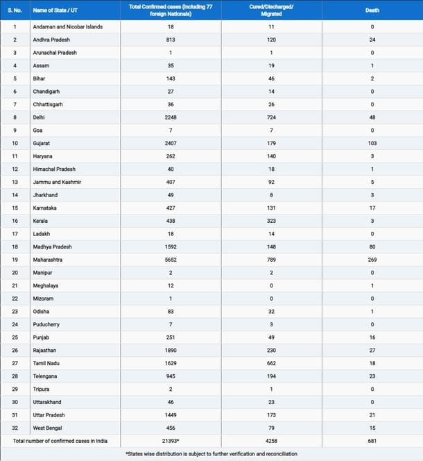 The total number of people confirmed positive for the coronavirus in India has increased to 21,393 while 681 deaths were reported across the country, as per the latest data updated at 8 am today (23 April) by the Health Ministry.