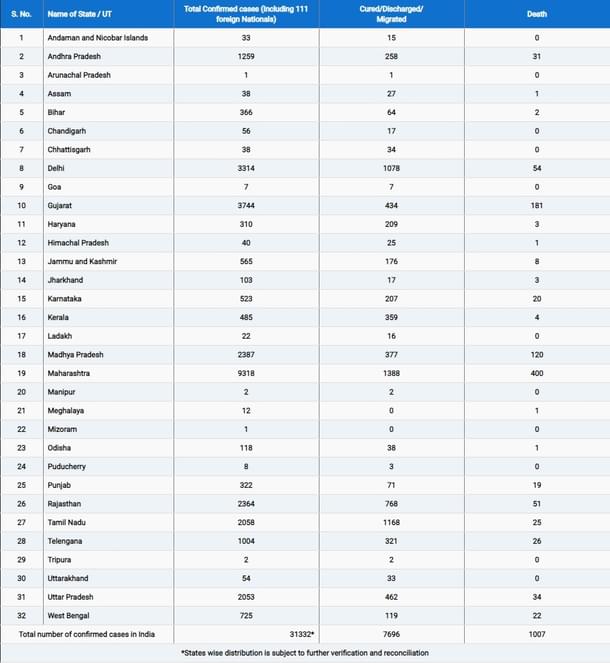 The total number of people confirmed positive for the coronavirus in India has increased to 31,332 while 1,007 deaths were reported across the country, as per the latest data updated at 8 am today (29 April) by the Health Ministry.