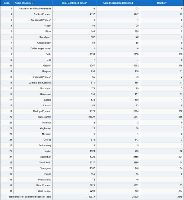 Other major states that have reported more than 1,000 cases, are West Bengal (2,290), Andhra Pradesh (2,137), Punjab (1,924) and Telangana (1,367).