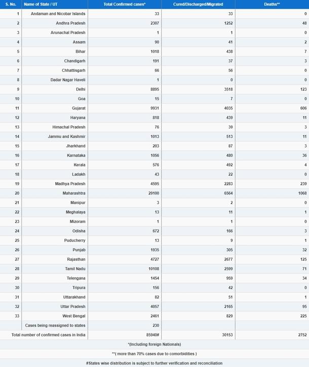 Other major states that have reported more than 1,000 cases, are West Bengal (2,461), Andhra Pradesh (2,307), Punjab (1,935), Telangana (1,454), Karnataka (1,018), and Jammu and Kashmir (1,013).